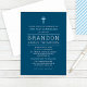Esta primeira comunhão sagrada na moda e o convite para comemoração do almoço para um rapaz apresenta uma redação personalizada moderna para o seu evento especial, acentuado por uma cruz azul-céu e cor azul-oceânica profunda. Um padrão de faixas de diagonal azul e branca do céu se veste na parte de trás do cartão.