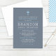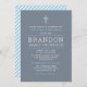 Esta primeira comunhão sagrada na moda e o convite para comemoração do almoço para um rapaz apresenta uma redação personalizada moderna para o seu evento especial, acentuada por uma cruz azul-céu e cor azul-ardente / fundo da cinza. Um padrão de faixas de diagonal azul e branca do céu se veste na parte de trás do cartão.