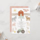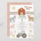 Moderno Trator Oink Baa Moo 1rua Aniversário Convite à fazenda moderna Bonita, convite de aniversário com vários animais de exploração, trator verde, cerca, celeiro e sol. A parte de trás deste convite de aniversário do pátio apresenta um padrão de gingham ou xadrez.
