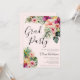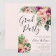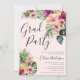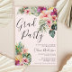 A modern tropical graduation party invitation template for a summer themed party. This trendy invite features watercolor hibiscus flowers, plumeria florals, palm leaves, and a pineapple.