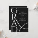Celebrate a proud academic milestone with this elegant minimalist graduation party invitation. The design features bold modern typography with the word “GRAD” displayed in a large vertical layout, creating a stylish and contemporary look. Clean white text on a sleek black background adds a timeless and sophisticated feel. A subtle flowing line detail adds movement while keeping the design simple and refined.