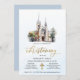 Moderno, elegante e empoeirado, cor azul-d-água, convite para Natal. A design inclui uma ilustração aquarela de uma igreja, uma escritura elegante em ouro para a palavra "Christening", uma cruz de ouro, e bloqueie letras maiúsculas para a informação de celebração. Para alterar as cores e fontes, escolha editar este design para abrir mais as opções adicionais de personalização.