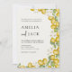 Entra num mundo de beleza vibrante com o nosso convite de casamento moderno e encantador. A frente é enfeitada com ilustrações originais, rústicas e inspiradas em aquarela que são um testamento da maior e mais recente do seu amor. O amarelo vibrante dos limões, com seu charme picante, está entrelaçado com uma folhagem verde-esbranquiçada e flores brancas delicadas. Ao contrário, você encontrará um padrão floral branco em um fundo azul complementar. Personalize com facilidade para criar seu convite perfeito para o casamento.