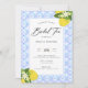 Um convite de chá para festas de chá de noiva com limões amarelos, desenhados à mão em aquarela e um padrão de azulejos azuis inspirado nas tradições mediterrânicas. Personalize-o com o nome, a data, a hora e todos os detalhes. Caligrafia moderna para o título.