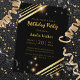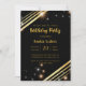 Design de convite de aniversário personalizado moderno e elegante, com linhas metálicas falsas em ouro e cintilações sobre fundo preto.