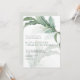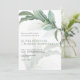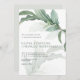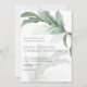 Folhas tropicais elegantes adoram este convite de casamento compensado. Detalhes alinhados no lado esquerdo. Folhas verdes, poeirentas e poeirentas, por detrás do texto, enquanto que um spray de folhas está no canto superior direito. Detalhes numa fonte moderna contemporânea. O inverso é feito em verde cinza complementar. Design criado para o BarefootBride™ por © WhimsicalArtwork™ Personalize texto, estilo de letra, cor e tamanho. Criamos que esta modelo é para facilitar a personalização com suas próprias informações. Esta é parte do nosso Pacote de Papelaria Dusty Blue Foliage, Peonies de Marfim, com casamento, chá de fraldas e outros artigos de papelaria.