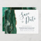 Este elegante e moderno salve o cartão de data apresenta um emerald verde aquarela agate border aparado com falso brilho dourado. O texto personalizável combina o script de escrita manual verde, as fontes em copperplate e itálico em um fundo branco. O verso apresenta um design emerald verde e dourado.