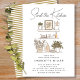 Este chá de panela bonito e único apresenta uma cena de cozinha com prateleiras cheio de ferramentas de cozinhar, plantas, pratos e um lançador. O design é perfeito para o próximo estoque do chá de panela da cozinha. Celebre a bela noiva a ser com este convite de uma espécie!