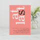 Moderno Na Última Festa de noivado De Rosa De Coral. Um design tipográfico na moda, com, finalmente, em texto grande girado e ao lado esquerdo no topo em branco e preto sobre um fundo de rosa de coral. A cor de fundo em ambos os lados pode ser alterada se você desejar por meio de Personalizar mais.