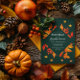 Design russa, mas moderna, com folhas de outono em tons de vermelho, laranja e amarelo contra um fundo verde-escuro sazonal