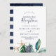 Este convite de receção de casamento náutico moderno com folhagem é perfeito para uma festa de pós-casamento na praia. O design botânico apresenta belas folhas verdes com flor navy e acentos de estrelas-do-mar douradas, dando-lhe um ambiente praiano. Os cartões de RSVP são vendidos separadamente, ou pode adicionar informações de RSVP no verso do cartão.