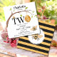 Linda menina transformando dois Convites de aniversário com um belo design de colmeia, incluindo uma colmeia pendurada em uma árvore, belas abelhas buzineiras Personalize este belo convite de aniversário com o nome da menina e detalhes da festa como data, hora, localização, endereço e rsvp, se necessário. Traseira do convite apresenta um belo medalhão de abelhas com listras negras e amarelas modernas