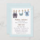 Uma paleta de cor de azul, de marrom e de branco, este convite é grande para anunciar a chegada dos bebés! Este convite moderno e elegante vem com roupa do bebé que incluem macacões da sarja de Nimes, um babador do bebê das bolinhas e um creeper do bebê que tenha um laço dos azuis marinhos. Fundo do teste padrão inclinado das listras azuis. Personalize facilmente com seus detalhes do partido.