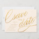 Estes convites únicos e modernos de save the date apresentam uma fonte fancy em efeito de folha de ouro falso sobre um fundo de cor champanhe doce, com os detalhes do anúncio do casamento em branco. O verso apresenta um padrão de listras douradas trendy. Altere a cor do fundo usando a ferramenta "Personalizar"!