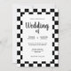 Outro convite de casamento original com uma moldura brilhante de azulejos xadrez preto e branco em um fundo branco. Uma variação divertida de um tema clássico e atemporal. Um design sofisticado para qualquer tipo de casamento em qualquer época do ano. Você pode alterar os nomes e a data no menu de personalização.