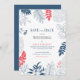 Moldura de flores e folhas tropicais em azul-marinho com uma moldura vermelho-coral, modelo de convite de Save the date personalizável.