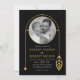 Este convite de casamento moderno apresenta um quadro de ouro cativante, que se assemelha a um pedaço de joias delicadas, com uma foto do casal posicionada sobre um fundo escuro. O quadro é embelezado com um detalhe de folha de um lado e uma seta do outro, adicionando um toque elegante ao design. Para completar o olhar, o verso do convite inclui um padrão único dos nomes dos casais em ouro sobre fundo preto, para um acabamento sofisticado e gracioso.