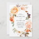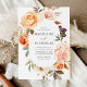 Convites florais de outono elegantes que exibem seus detalhes de casamento cercados por um quadro oval de flores de aquarela, suculentos e folhas em tons de rosa-pincel, pêssego, laranja, branco, marrom e verde. Os convites de casamento florais do outono invertem-se para apresentar um fundo verde sólido.