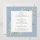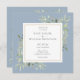 Possui delicadas folhas de aquarela rústica de eucalipto em fundo azul empoeirado. Este convite de casamento botânico moderno pode ser personalizado com todas as suas informações especiais sobre o dia do casamento, incluindo seu RSVP, acomodações e detalhes adicionais. Projetado por Thisnotme©