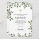 Estes adoráveis e mínimos convites para a Primeira Comunhão apresentam folhas verdes, em cores aquáticas, num fundo branco e limpo. Texto serif moderno misturado com a tipografia da escrita de tendências adiciona uma nova aparência para tornar este convite perfeito para estilo rústico, minimalista ou elegante. Uma cruz de ouro falsa aparece no topo.