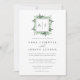 Nosso convite de casamento para monograma com efeito de estufa apresenta suas iniciais, monograma ou duograma no topo, dentro de uma camada quadrada de folhagem verde de aquarela, folhas botânicas e pequenas flores brancas em um fundo branco nítido. Uma visão moderna da tendência botânica dos casamentos no inverno, queda romântica ou núpcias de outono, ou casamentos elegantes à noite de verão.