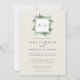 Nosso convite de casamento para monograma com efeito de estufa apresenta suas iniciais, monograma ou duograma no topo, dentro de coroa quadrada aninhada de folhagem de aquarela verde, folhas botânicas e flores brancas minúsculas em fundo de marfim macio. Uma visão moderna da tendência botânica dos casamentos no inverno, queda romântica ou núpcias de outono, ou casamentos elegantes à noite de verão.