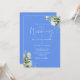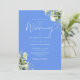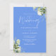 Este convite de casamento com folhas de verde botânico elegante e azul centáurea pode ser personalizado com suas informações em tipografia chic com suas iniciais monograma no verso. Criado por Thisisnotme©