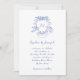 Estes convites para casamento azul e branco na moda apresentam uma ilustração azul desenhada à mão de uma crista de casamento com cherubs e flores, e suas iniciais ou monograma no centro. O texto é um roteiro manuscrito para um olhar caprichoso e romântico.