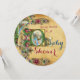Pergaminho medieval antigo elegante, design floral ao estilo vintage engraçado com um bebê e cegonha voadora entre o belo rosa, o ouro, as rosas vermelhas, as flores de primavera e as folhas verdes de Búlgaro Lumini (c).