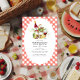 Reúna sua família e amigos para um piquenique cheio de CHURRASCO com este convite de gingham vermelho rústico. Apresentando uma deliciosa cena piquenique cheia de vinho, uvas, e um cesto de piquenique, esta design evoca um senso de calor e união. Perfeito para reuniões familiares, festas ao ar livre ou comemorações de verão, este convite dá o tom para um dia memorável de boa comida e companhia de excelentes. Personalize os detalhes do evento para torná-lo exclusivamente seu!