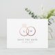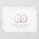 Um monograma moderno fica brilhando com anéis de casamento falsos rosa dourados entrelaçados e um simples fazer de texto personalizado que salva o cartão-postal de uma nova versão clássica com texto em branco e preto limpo. Personalize todo o texto desse mínimo, salve a data e adicione uma foto de noivado para uma aparência simples e reduzida, enquanto dirige seus convidados para salvar a data do seu grande dia.