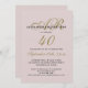 Elegante convite de aniversário refinado. Aqui para a comemoração do aniversário de 40 anos, mas o número da idade é personalizável. Com monograma Letras iniciais, número de idade e nome na caligrafia dourada, escrita manuscrita. Pasta de na moda chic limpa, poeirenta, cor-de-rosa e elegante tipografia negra elegante.