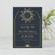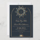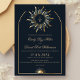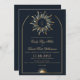 Este design apresenta arte celestial marinho azul e ouro, incluindo o logotipo do sol de onda linear boêmia e o convite personalizado para casamento de arcos. Este produto pode ser facilmente personalizado. Se precisar de ajuda para a personalização do produto ou se precisar de produtos correspondentes, por favor contacte-me através do Zazzle.