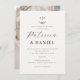 Invitaciones de boda en español. Esta invitación de boda elegante lleva um monograma personalizado em la parte superior, diseñado con las iniciales de la pareja y un detalle rústico de ramitas dibujadas a mano. El primer nombre se presenta en caligrafia moderna y el Segundo en mayúsculas con tipografía clásica. Justo debajo, la fecha, el año y la hora aparecendo em distribuidos em tres líneas, seguidos do lugar de ceremonia y la direción. Una línea divisoria horizontal separa las secciones del texto. Al pie de la tarjeta, hay espacio para añadir información adicional como la recepción, el código de vestimenta o cualquier detalle importante. El reverso lleva una foto de la pareja, convirtiendo la invitación en un recuerdo especial. Un diseño sencillo y elegante, ideal para bodas formales. Versión Inglés también en lábil.