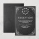 Cartão de recepção elegante com uma bela moldura branca ornamentada e monograma contra um fundo de quadro negro.