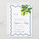 At the top, the couple’s monogrammed initials set a refined tone, followed by the wedding details beautifully arranged within the flowing blue border. The combination of classic typography, fresh lemon accents, and calming blue waves creates a timeless yet cheerful invitation style.