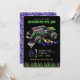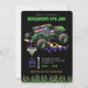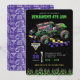 Este design inspirado no Monster Jam de alta energia apresenta o icônico caminhão monstro Grave Digger correndo em um fundo preto ousado com chamas neon verdes, detalhes roxos e um padrão dinâmico de bandeira xadrez. A ilustração do caminhão poderoso está na frente e no centro, criando uma aparência cheia de ação que parece rápida, alta e emocionante. Letras verdes brilhantes e detalhes roxos vívidos adicionam ao tema cheio de adrenalina, tornando este design perfeito para crianças que amam caminhões monstro e corridas emocionais. Detalhes personalizados do evento, como nome, idade, data, hora e local, são exibidos claramente, tornando o design divertido e funcional para uma celebração de aniversário memorável com tema de caminhão monstro.