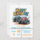 Uma ilustração com uma aquarela vibrante da cesta de aniversário de um rapaz, com dois excitantes caminhões monstruosos. Um caminhão é um clássico design com pneus sobredimensionados, enquanto o outro é um feroz caminhão com tubarões com dentes salientes da sua grelha. O fundo é branco puro, destacando os pincéis macios e o efeito da aquarela artística. Perfeito para decorações de festas de aniversário, convites ou impressões temáticos.