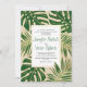 A monstera tropical verde e dourada e a palma das folhas de bege convite para o casamento. Mostra um padrão de folhas tropicais com contorno de ouro sobre o bege e seu texto em um quadro branco. O verso inclui um padrão de bolinhas dourada.