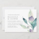 Nosso convite para o casamento Mountain Meadow combina florais românticos de aquarela com um layout simples e uma elegante inscrição para um visual moderno e mínimo. Design apresenta os detalhes do seu casamento, acentuados por um solteiro esmagado de folhas botânicas verde-palha e verde-aquarela cor pálida e botões de flores roxas lavandas.