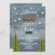 Um convite de chá de fraldas com ilustração de um bebê urso solto em um galho de árvore cercado por estrelas. Ilustração de montanha e árvores no fundo. Personalize o texto. O fundo é a cor da água azul escura inspirada.