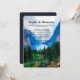 Um convite de casamento com uma bela fotografia de uma cena agradável e tranquila da natureza. Floresta verde vibrante na frente e montanhas azuis sombrias nas costas. Com um céu branco nublado e sonhador. Mistura e mágica.