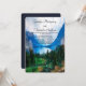 Um convite de casamento com uma bela fotografia de uma cena agradável e tranquila da natureza. Floresta verde vibrante na frente e montanhas azuis sombrias nas costas. Com um céu branco nublado e sonhador. Mistura e mágica.