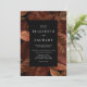 Este moderno convite botânico apresenta um fundo escuro e moderado de folhas de outono em tons de ferrugem. Personalize-o com os nomes da noiva e noiva e outros detalhes do casamento em branco num retângulo preto. A imagem das folhas de ferrugem é repetida na parte de trás da carta. Ideal para um casamento outono!