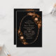 Um convite de casamento preto elegante com um arranjo floral rústico de laranja rústico queimado numa estrutura oval.