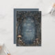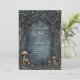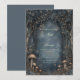 Invite your guests into a realm of nighttime wonder with this atmospheric enchanted forest scene. The composition features a striking midnight blue forest background, centered by a delicate, ornate bronze gothic arch frame that perfectly highlights your event details. Intricately detailed mushroom clusters and tiny wildflower sprigs ground the base of the scene, while hundreds of glowing stardust motifs drift through the dense, leafy canopy above. This wedding invitation is an ideal choice for a celestial, dark academia, or gothic woodland ceremony. These motifs ensure your event details are presented within a mysterious and romantic atmosphere that sets an enchanting tone for your special day.