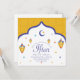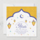 Convite para celebrações Iftar ou Eid para Ramadã em tons de ouro, azul e branco. Este brilhante e colorido design tem o contorno de uma mesquita, um padrão árabe dourado, lua crescente e estrelas e lanternas fanáticas.