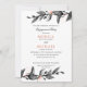 Folha e flor elegantes inspiraram design de convite para festa de noivado de casamento com galhos delicados de folhagem em preto, cor-de-rosa-cinza e coral em fundo branco. Cartões invertidos a faixas pretas e brancas. Um design moderno e clássico para casamentos chic elegantes para qualquer estação. Coordene-se para a coleção de casamentos de Luz Bloom.