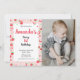 Framboesa de primeiro aniversario de morango primeiro Convite. Convite encantador com impressão de morango, foto e texto personalizável de um lado; e com impressão xadrez em cores pastel e texto editável do outro lado. Bonito festa do primeiro convite à fruta. (Foto cortesia de Evita Tomsevica, da Unsplash).