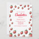 Muitos morangos doces e vermelhos em um convite de aniversário que seria perfeito para uma festa de aniversário de verão.